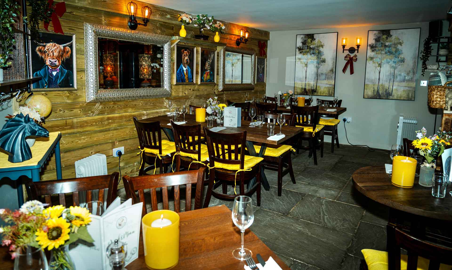 Tuck yourself away in this intimate, light-filled space, designed for quiet conversation and relaxed dining. Here, large windows frame a view of the garden, and enjoy the gentle shimmer of twinkling lights among the trees as dusk settles.
